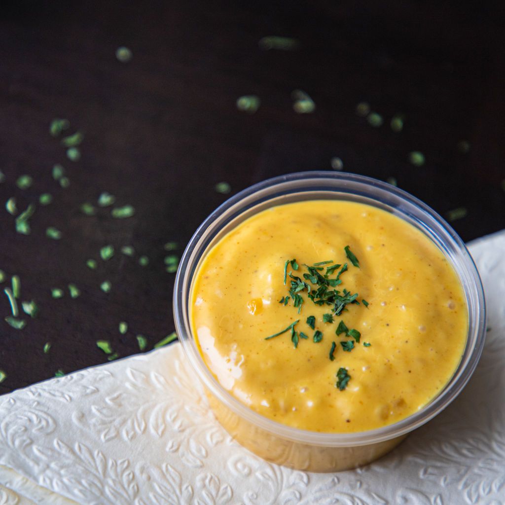Deze gele, zoete saus is gemaakt met uien, mayonaise en een mix van kruiden.